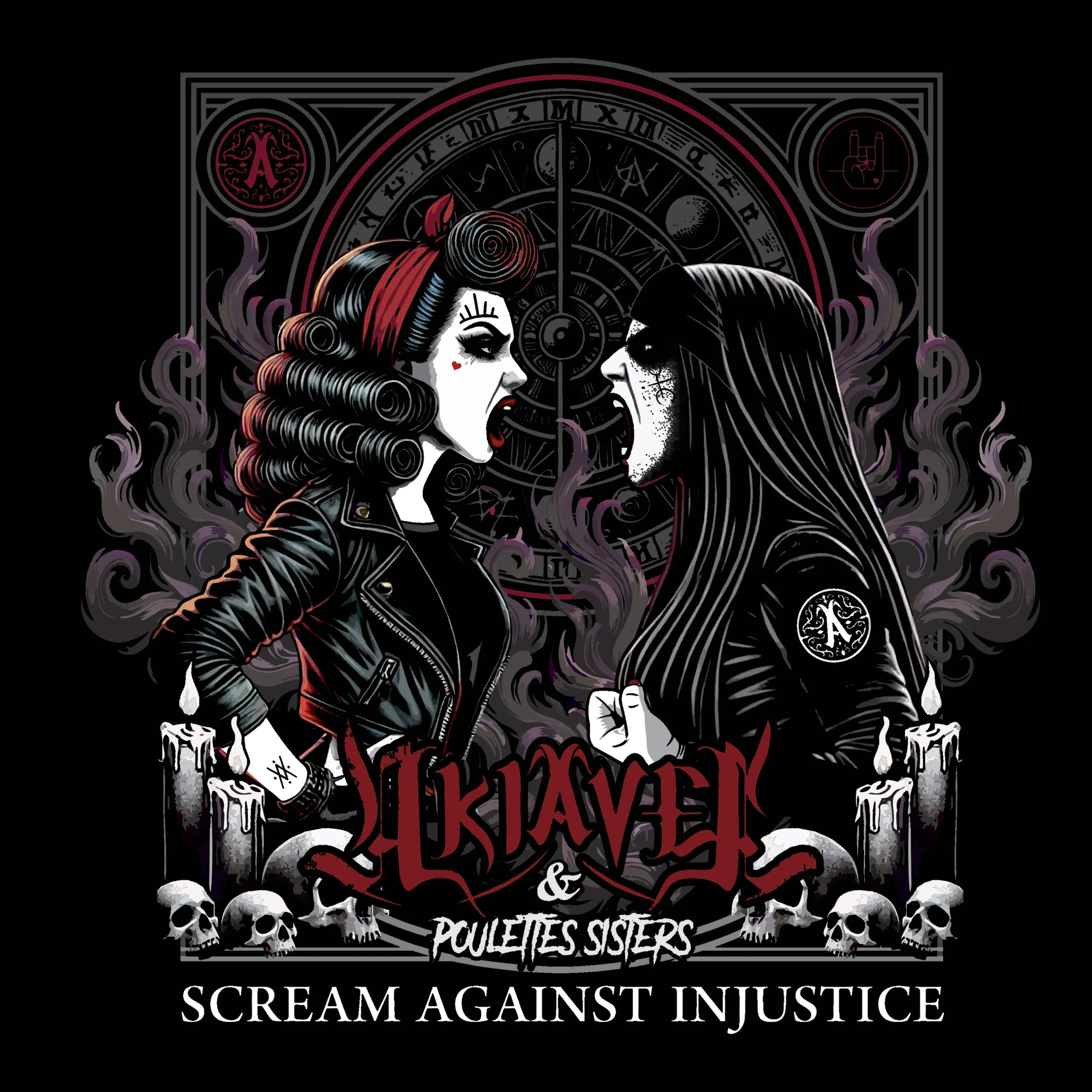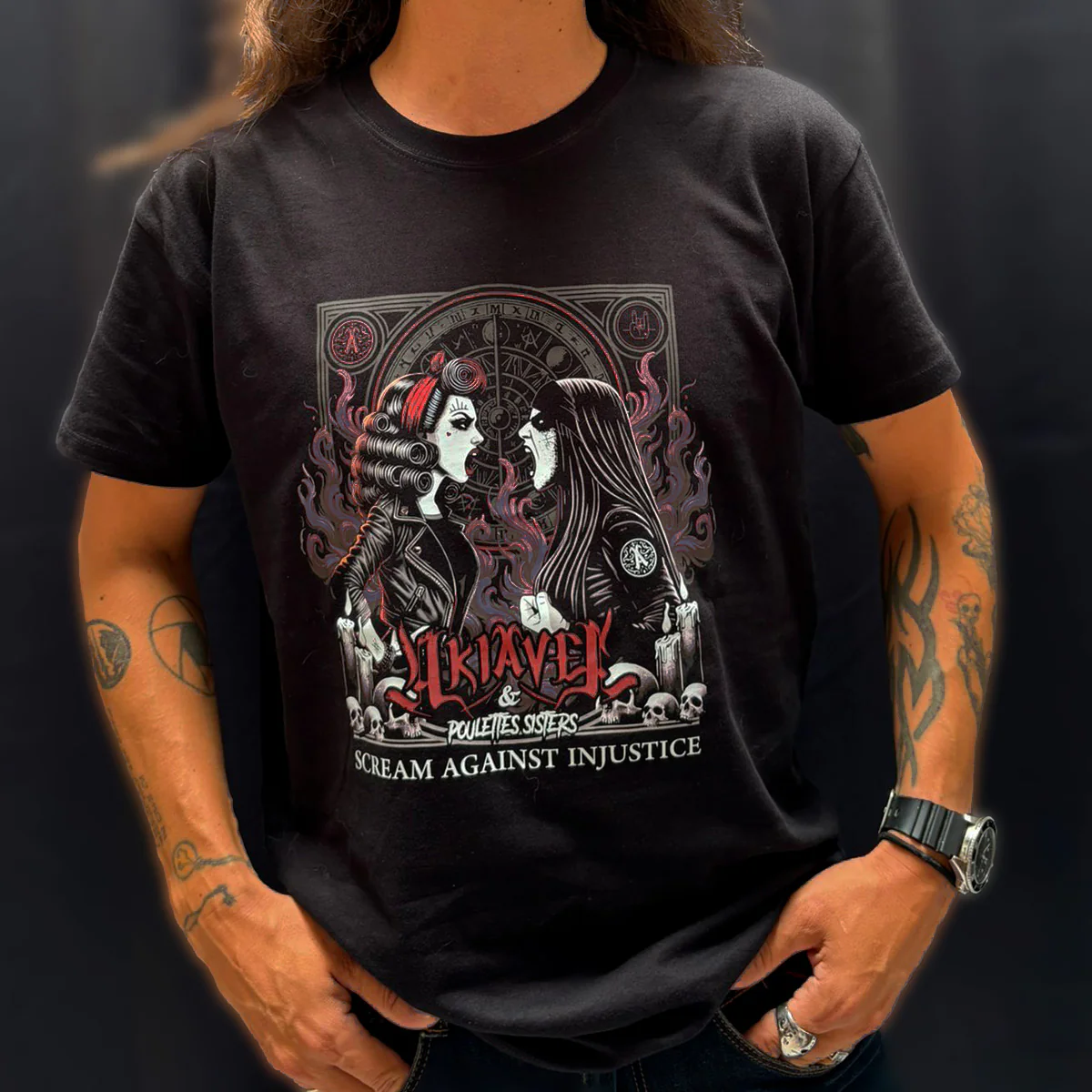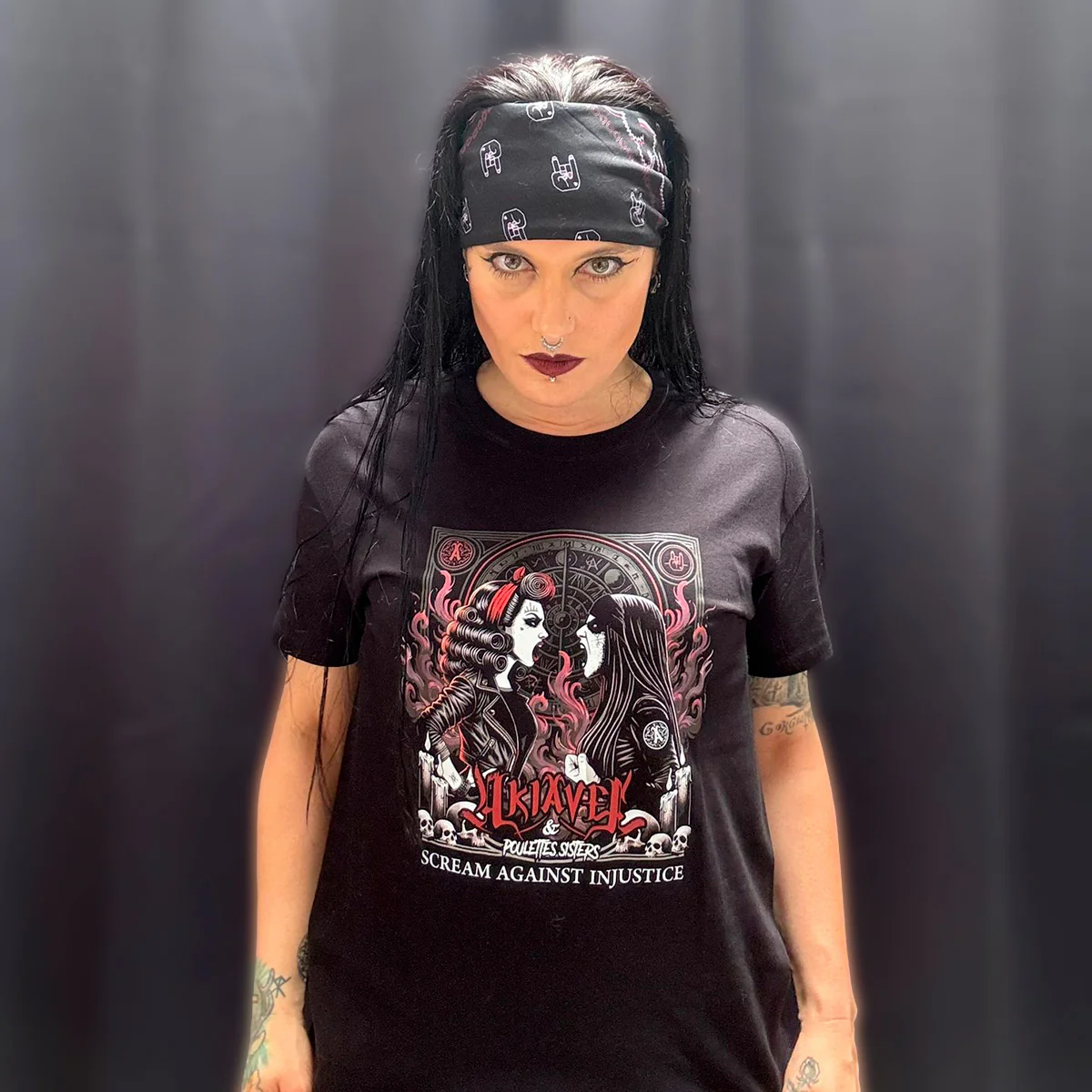 Hurlez haut et fort contre l’injustice avec ce débardeur noir au visuel percutant, fruit de la collaboration entre le groupe de Death metal AKIAVEL et Poulettes Sisters.